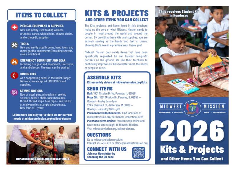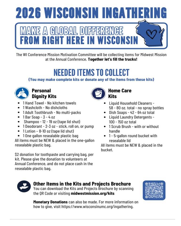 We are encouraging people to help with items or $$$$ needed. Help make a difference in the lives of others. You can drop off your donation kits/items or monies at the Merrillan UMC Church 303 E Pearl St. Merrillan WI 54754 on Sundays by 9:45 am. Or mail a check. All items and monies need to be received by May 24th, 2026, so they can be taken with us to the Conference. We thank you all for your gratitude in advance